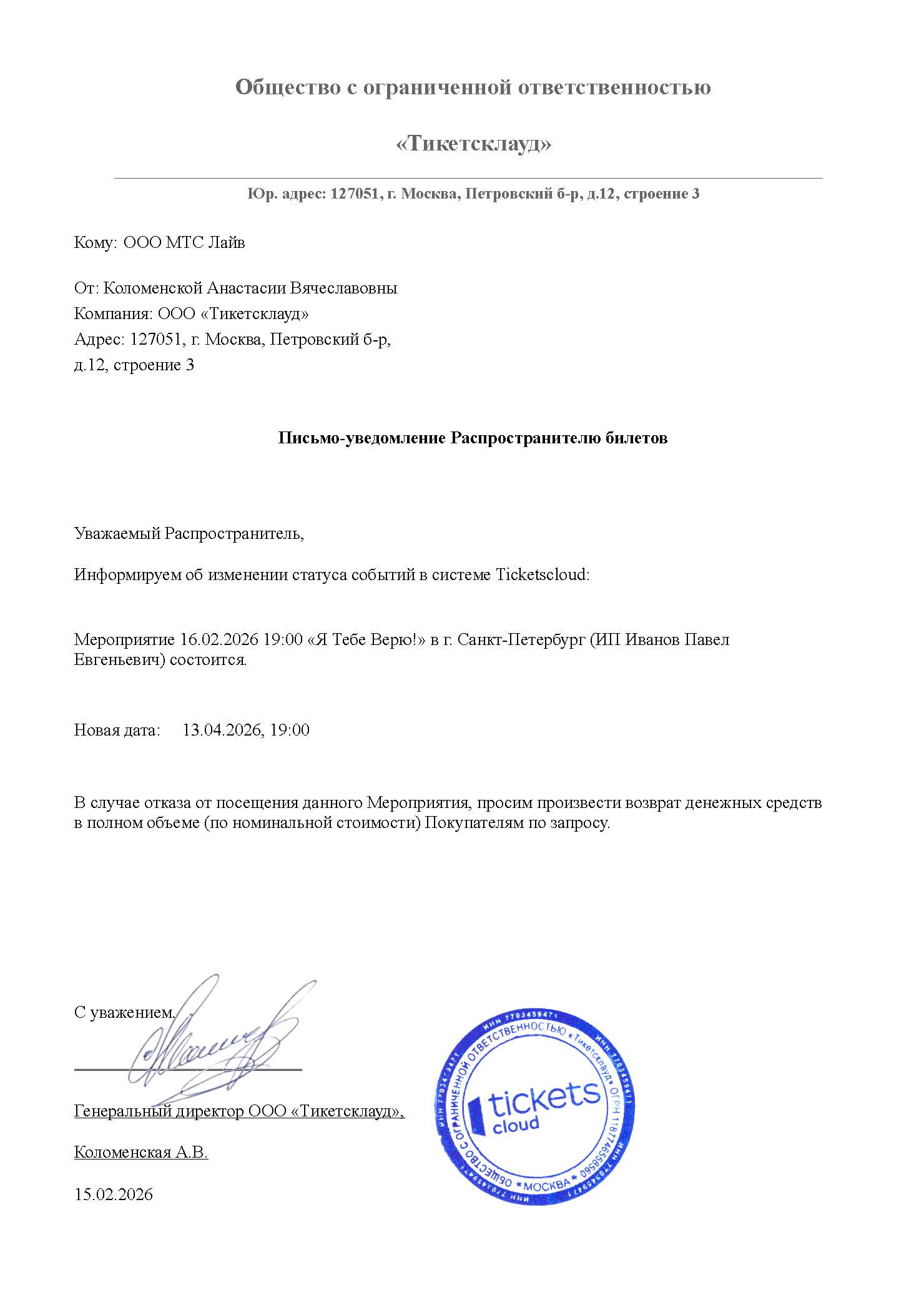 Уважаемый клиент! Спешим сообщить, что по информации, полученной от организатора, Мюзикл «Я Тебе Верю!», запланированный на 16 февраля 2026 года в 19:00 в Театре юных зрителей им. Брянцева, перенесен на 13 апреля 2026 года, начало в 19:00. Ранее приобретенные билеты действительны на новую дату, обменивать их не нужно. Если вам не удобно посетить мюзикл в новую дату, вы можете вернуть билет по кнопке в личном кабинете во вкладке «Заказы». Деньги за электронные билеты вернутся автоматически в полном объёме на карту, с которой была произведена оплата. Если вы купили билет в кассе Ticketland.ru за наличный расчет, то обратитесь, пожалуйста, на почту: vozvrat@ticketland.ru. С уважением, команда поддержки Ticketland.