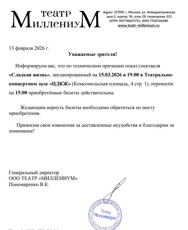 Уважаемый клиент! Спешим сообщить, что по информации, полученной от организатора, спектакль «Сладкая жизнь», запланированный на 15 марта 2026 года в 19:00 в ЦДКЖ, перенесен по времени, начало состоится в 15:00. Ранее приобретенные билеты действительны, обменивать их не нужно. Если вам не удобно посетить мероприятие в новое время, вы можете вернуть билет по кнопке в личном кабинете во вкладке «Заказы». Деньги за электронные билеты вернутся автоматически в полном объёме на карту, с которой была произведена оплата. Если вы купили билет в кассе Ticketland.ru за наличный расчет, то обратитесь, пожалуйста, на почту: vozvrat@ticketland.ru. С уважением, команда поддержки Ticketland.
