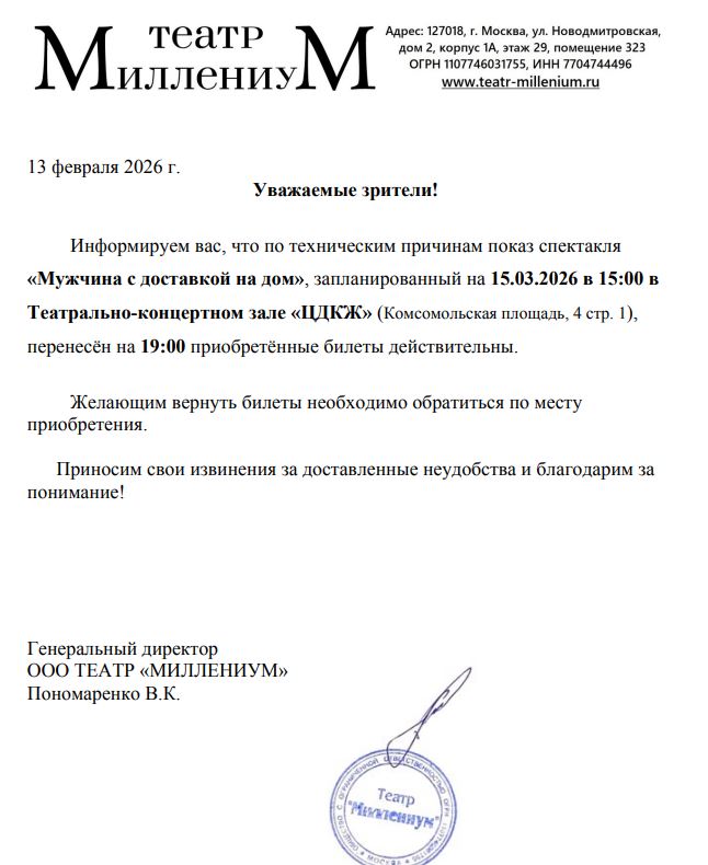 Уважаемый клиент! Спешим сообщить, что по информации, полученной от организатора, спектакль «Мужчина с доставкой на дом», запланированный на 15 марта 2026 года в 15:00 в ЦДКЖ, перенесен по времени, начало состоится в 19:00. Ранее приобретенные билеты действительны, обменивать их не нужно. Если вам не удобно посетить мероприятие в новое время, вы можете вернуть билет по кнопке в личном кабинете во вкладке «Заказы». Деньги за электронные билеты вернутся автоматически в полном объёме на карту, с которой была произведена оплата. Если вы купили билет в кассе Ticketland.ru за наличный расчет, то обратитесь, пожалуйста, на почту: vozvrat@ticketland.ru. С уважением, команда поддержки Ticketland.