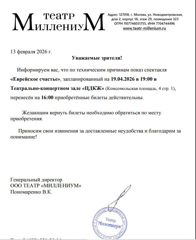 Уважаемый клиент! Спешим сообщить, что по информации, полученной от организатора, спектакль «Еврейское счастье», запланированный на 19 апреля 2026 года в 19:00 в ЦДКЖ, перенесен по времени, начало состоится в 16:00. Ранее приобретенные билеты действительны, обменивать их не нужно. Если вам не удобно посетить мероприятие в новое время, вы можете вернуть билет по кнопке в личном кабинете во вкладке «Заказы». Деньги за электронные билеты вернутся автоматически в полном объёме на карту, с которой была произведена оплата. Если вы купили билет в кассе Ticketland.ru за наличный расчет, то обратитесь, пожалуйста, на почту: vozvrat@ticketland.ru. С уважением, команда поддержки Ticketland.